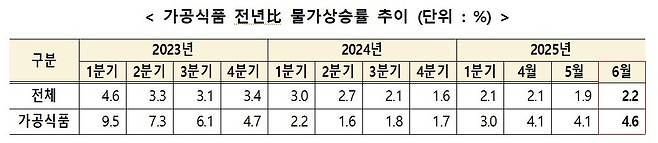 2025년 6월 기준으로 가공식품 소비자물가가 전년 동월 대비 4.6% 상승했습니다.
